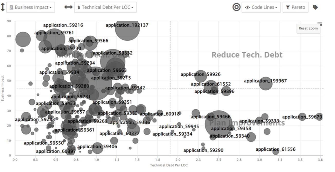 Tech debt insights (X-axis), Business criticality (Y-axis), Application size (bubble size)