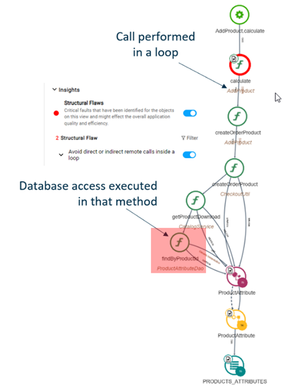 Conversely, a traditional code analyzer may greenlight a piece of code, yet its immediate context renders it potentially dangerous in terms of user experience. A common example of that is when a small piece of code, nested within a loop, makes a call to a distant REST service or a remote database (fig 2). While a single remote call may be acceptable, making 1,000 consecutive calls, with time-consuming roundtrips, especially when far from the data source, could severely hinder the system. There are numerous situations where the individual unit quality will be seen as “good”, but it does contain technical debt negatively impacting application behavior. Thus, I need to analyze the unit of code not in isolation but in the context of the whole system, considering the flows from the user input layer to the business logic, APIs, frameworks, data access layers, down to the database. So, how do I do that? Couldn’t my team understand the context by looking at the code and talking to architects? |
