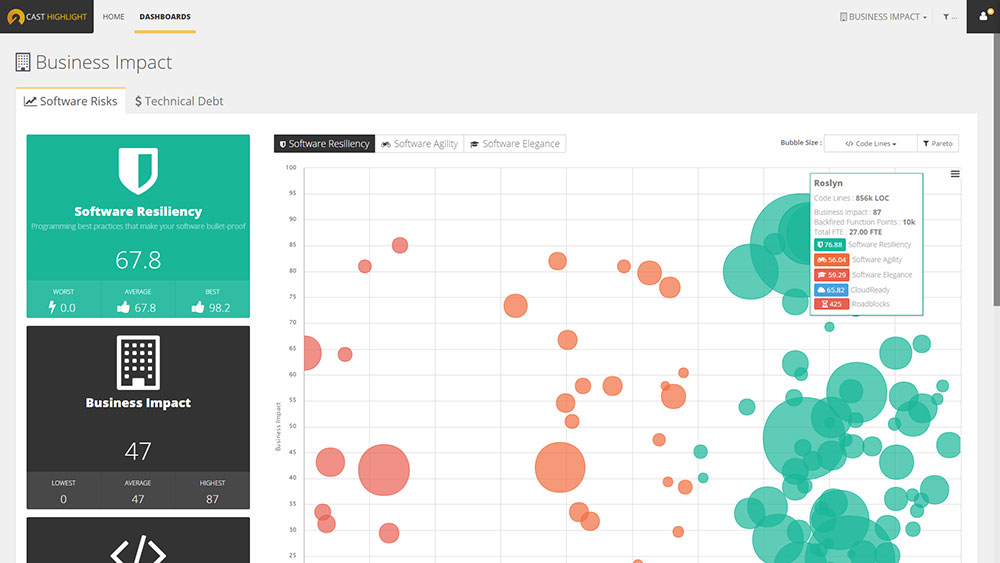 CAST analyses the code and integrates the results with business context to create heat maps that identify trouble spots, prioritized based on business impact of the interconnected and dependent components of the portfolio.
